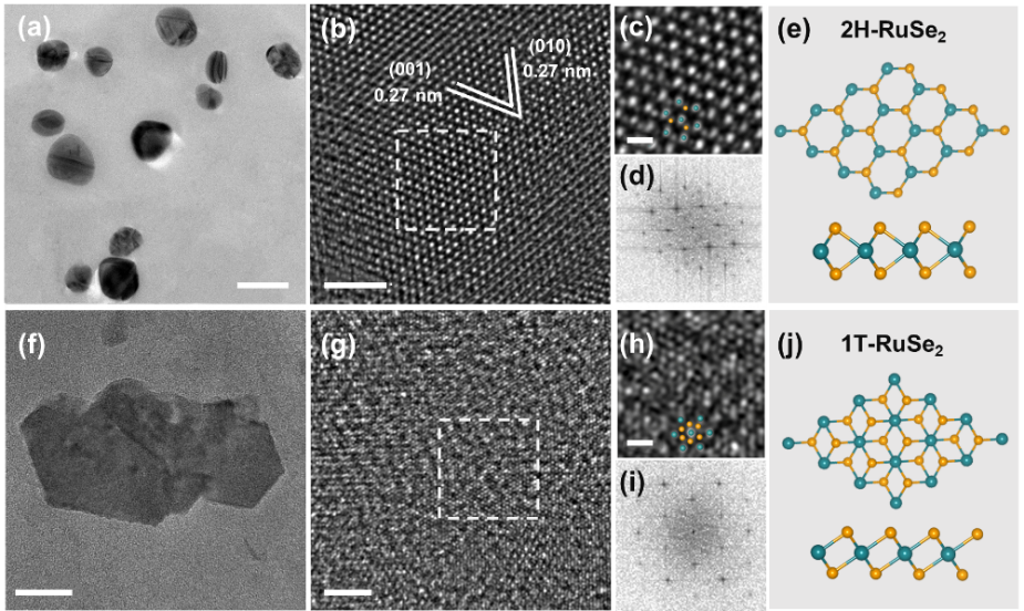 层状过渡金属硫属化合物纳米材料(TMDs),如MoS2和MoSe2等,以其独特的性能及其在电子、光电探测器、晶体管和电催化产氢(HER)等方面的潜在应用而备受关注。尽管已经有很多方法致力于制备不同组分和不同相的TMDs,目前层状TMDs的研究仍主要集中在元素周期表4到8族的金属。由于缺乏有效的合成方法,直到现在,六方相RuSe2尚未有实验报道。