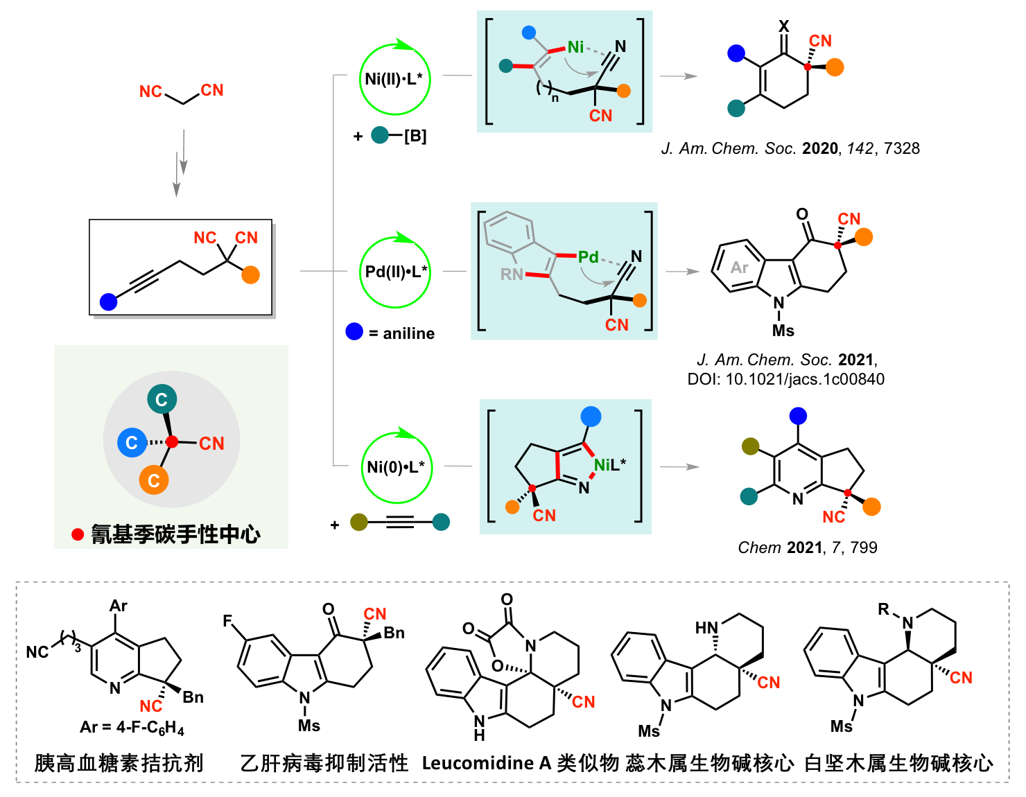 在课题组前期工作的基础上(图1上,J. Am. Chem. Soc.2020,142, 7328),他们最近报道了一种手性钯催化的邻炔基苯胺取代的丙二腈衍生物分子内反式氨钯化串联氰基去对称加成反应,实现了在生物碱合成中广泛应用的四氢咔唑酮的不对称构建(图1中,J. Am. Chem. Soc.2021, DOI: 10.1021/jacs.1c00840)。通过零价镍启动,还实现了镍催化的丙二腈和炔烃的[2+2+2]环化反应高效构建了含氰基季碳中心的多取代吡啶(图1下,Chem2021,7, 799)。这些方法为具有重要生理功能的分子和天然产物合成提供了新的思路。