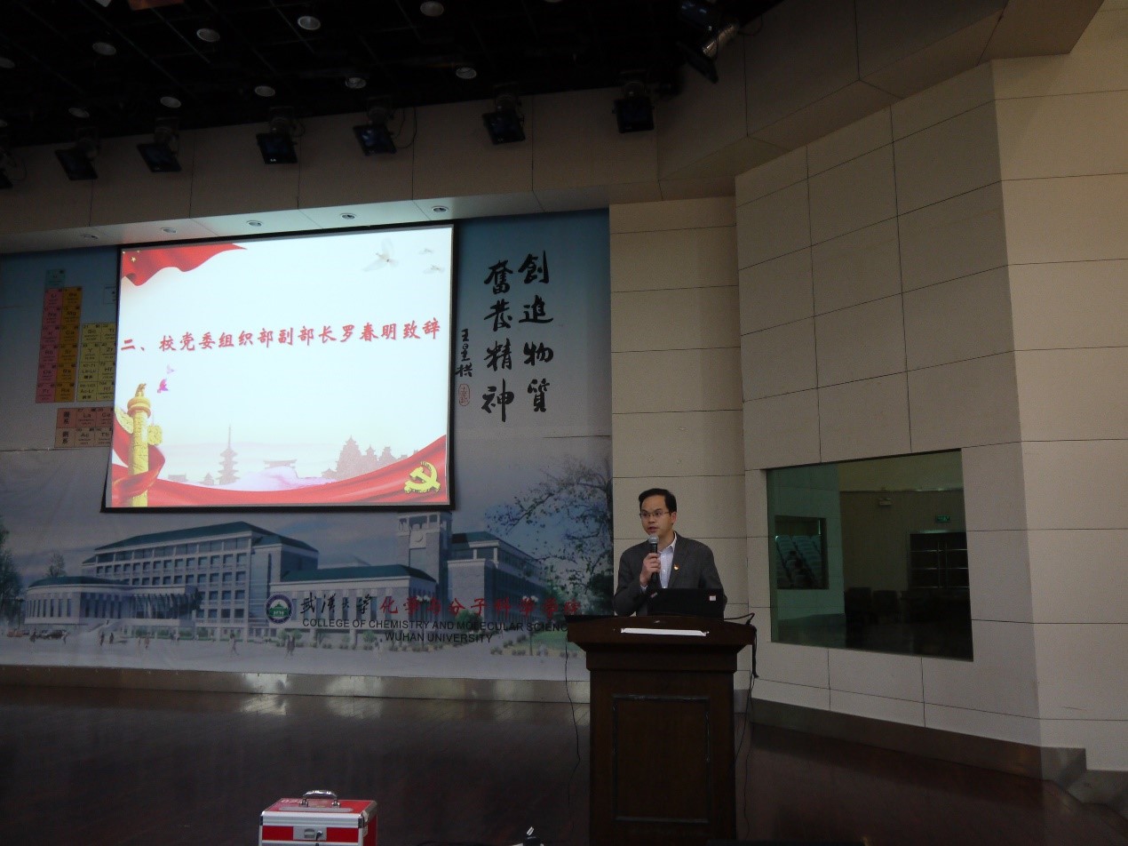 党委组织部副部长罗春明同志代表学校党委组织部向大会的召开表示热烈祝贺,向出席会议的全体党员表示诚挚问候,对学院党委近年来的工作给予了高度评价。他指出,今年是中国共产党成立100周年,也是学校“十四五”规划的开局之年,学校正在大力推进“双一流”建设上水平,各项改革举措稳步推进,这也为基础学科的建设和发展带来了难得的机遇。他希望化学与分子科学学学院党委要切实加强党的政治建设,不断增强党的政治领导力、思想引领力、群众组织力、社会号召力,引导师生增强“四个意识”、坚定“四个自信”、做到“两个维护”,落实基层党建工作重点任务,深入贯彻新时代党的组织路线,不断提高基层党建工作质量,以此次党代会的召开和“十四五”规划为契机,系统总结过去,科学谋划未来,在学院的发展战略、目标任务、主要举措等方面,进一步统一思想、凝聚共识、形成合力、共谋发展,进一步推进学科建设,提高人才培养质量,提升科学研究水平,加强学院内部治理,为建设一流化学学科,实现学院“十四五”发展目标提供强大奋进力量。