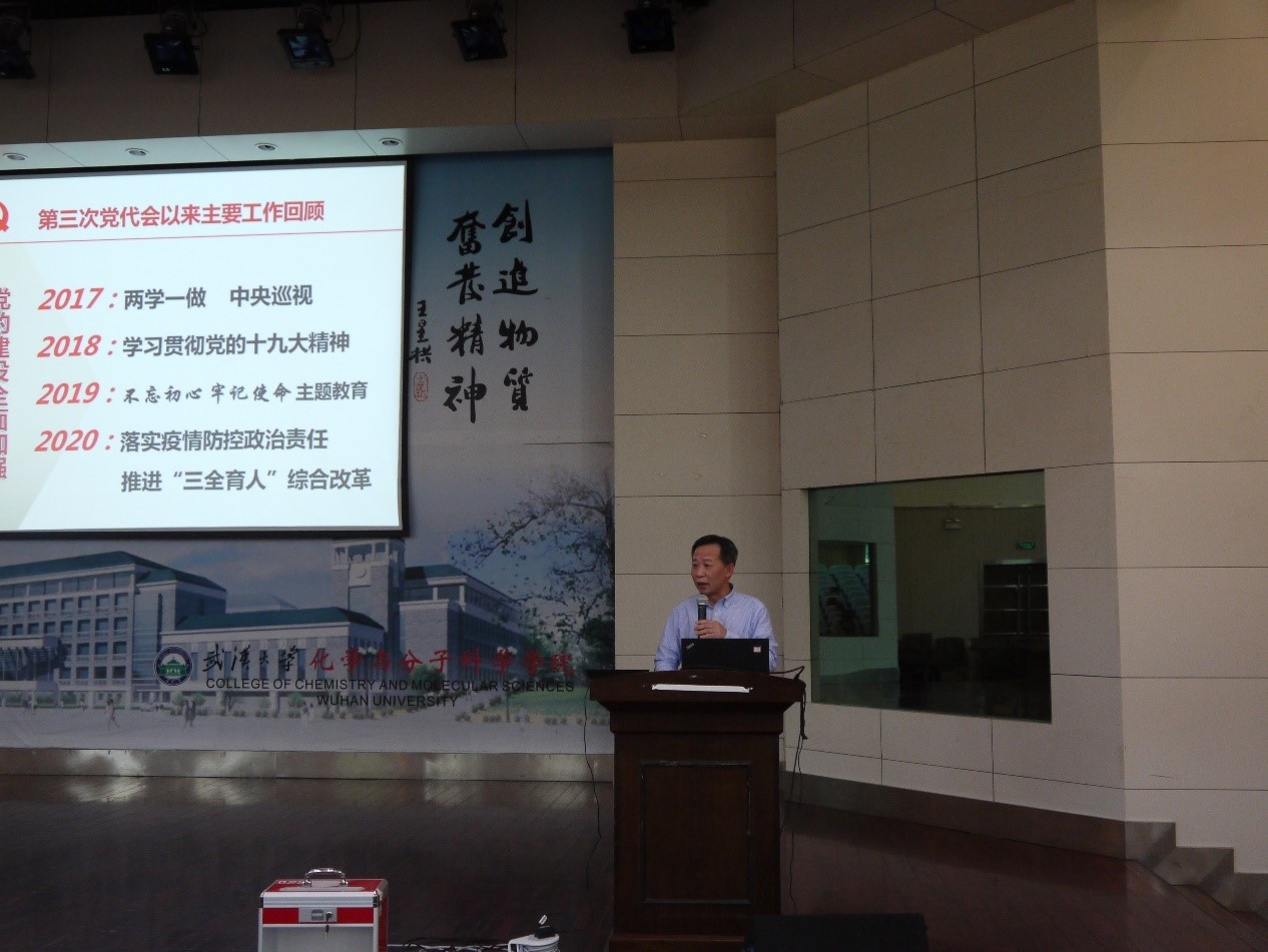 他号召全院师生党员要紧密团结在以习近平同志为核心的党中央周围,充分发挥共产党员的政治核心、战斗堡垒和先锋模范作用,带领全院师生,同心协力、锐意进取,不忘初心,砥砺前行,团结带领全院师生员工不断开创学院发展的新局面,为早日建成特色鲜明,世界一流的化学学科而努力奋斗,以饱满的精神和优异的成绩迎接建党100周年!