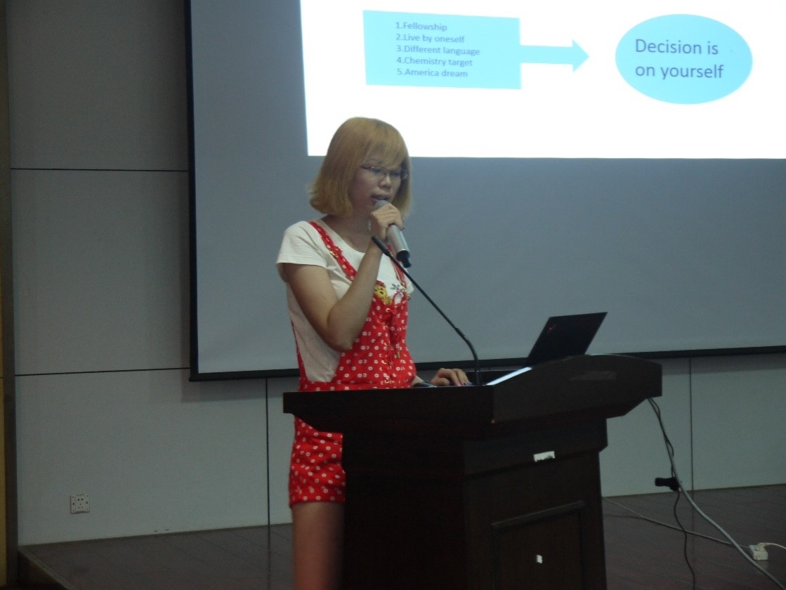 接下来是无机化学专业的科硕黄利莉,她将要去美国的弗吉尼亚大学继续攻读博士。流利的英语开场白加英语PPT让大家见证了她努力准备了一年半的英语实力,她详细地为大家分享了她准备英语和申请学校的经历,让有出国打算的同学看到了打好扎实的语言基础、结合靠谱中介帮助的重要性。