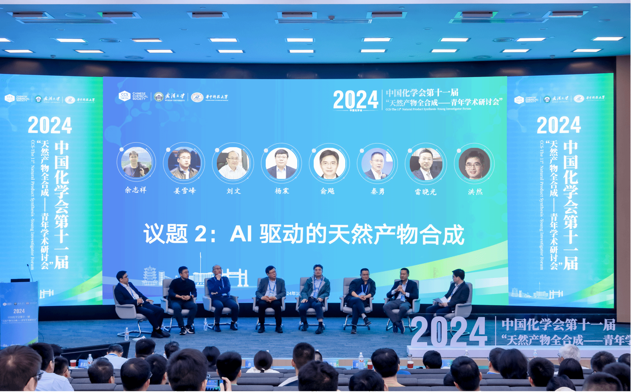 本次会议的圆桌讨论环节由余志祥教授和洪然研究员共同主持,邀请了俞飚院士、杨震教授、秦勇教授、刘文教授、雷晓光教授和姜雪峰教授作为讨论嘉宾,设置了两个核心主题“天然产物合成的新使命”和“AI驱动的天然产物合成”。嘉宾们围绕主题展开了深入的交流探讨和激烈的思想碰撞。他们共同回顾了20世纪天然产物全合成的发展历程与传统,讨论了本领域的新趋势和面临的新挑战,探讨了人工智能技术的崛起如何为天然产物的发现与合成方法带来变化和发展契机。此次圆桌会议不仅激发了参会者之间的强烈共鸣,更为推动天然产物合成领域的持续发展注入了新的活力与思考。
