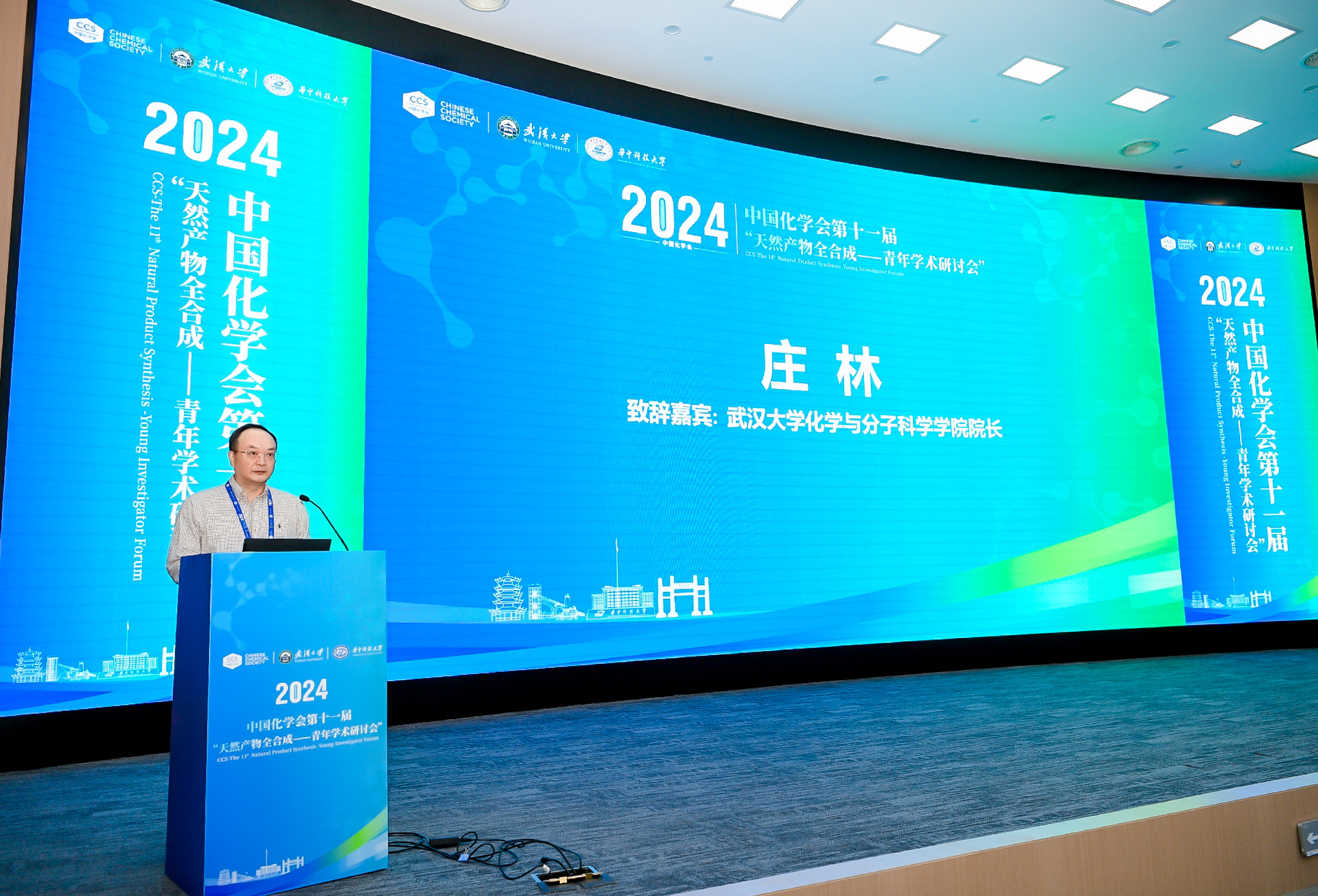 党委书记黄卫华教授发表了致辞,他代表学院对参会的专家、组织者、志愿者、报告人、赞助商和工作人员表示了感谢,并对会议的成功举办表示了祝贺。他表示期待未来有更多的青年学者加入该领域,共同探索天然产物全合成的奥秘。