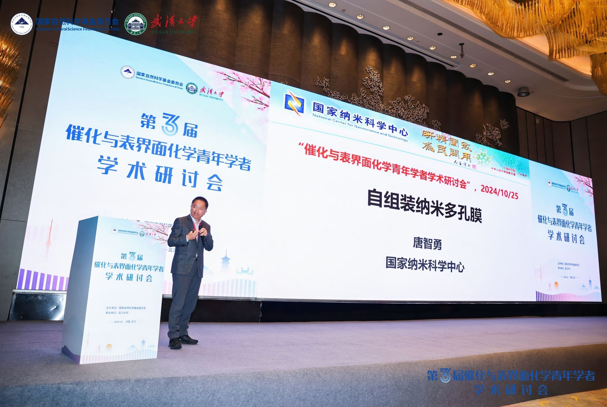 在大会特邀报告环节,李灿院士以“从化石能源催化到太阳能光催化——浅谈学术研究的一些体会”为主题,介绍了长期深耕在表界面催化及物理化学领域的研究经历,从化石能源催化到太阳能光(电)催化及其人工光合成的科学研究,特别发展了与表界面相关的光谱表征技术。并且,还与青年学者分享了一些学术研究的体会和感悟。唐智勇院士以“自组装多孔分离膜的构建及应用”为主题,介绍了膜分离技术相对于传统热分离技术的优势,以及通过化学自组装构建分子尺度高度可控的分离功能膜材料,突破传统膜分离材料分离通量和分子尺度选择性的瓶颈。此外,北京航空航天大学郭林教授介绍了“无机非晶纳米材料的可控制备及特性”、复旦大学徐昕教授介绍了“迈向准确高效的多相催化理论模拟”、国家纳米中心聂广军研究员介绍了“纳米-生物表界面调控与新药创新”。