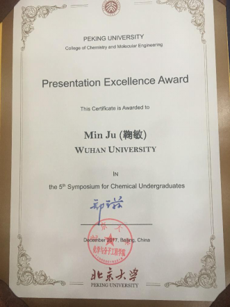 2014级本科生鞠敏参加口头报告并斩获优秀报告奖,2014级本科生张凡、2015级本科生杨晨露、刘奕侬参与了墙报展示并积极发问,与参会师生进行交流。在闭幕式上,北京大学化学与分子工程学院副院长裴坚公布了本次交流会的优秀报告和墙报奖,并表示本科生科研素养的水平和进步让人欣喜。