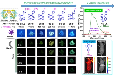 在此次的研究中,李振课题组设计合成了一系列的吩噻嗪衍生物,并通过改变取代基的种类来调节它们的室温磷光性质,实现磷光寿命从88 ms到410 ms的显著增长。通过细致的晶体分析,并辅助以理论计算,他们发现增加取代基的吸电子能力能够增强晶体中分子间的π-π堆积作用,从而稳定激发三线态,实现超长室温磷光的发射。更有意思的是,当取代基为三氟甲基时,首次观察到奇特的光诱导室温磷光现象,这是以前从未被报导的。最后,利用化合物CS-F具有超长磷光寿命的特性做了生物体内成像的应用。该研究不仅深入的研究了纯有机室温磷光的内部机理,而且实现了对这类材料的实际应用,极大地促进了这一领域的发展。