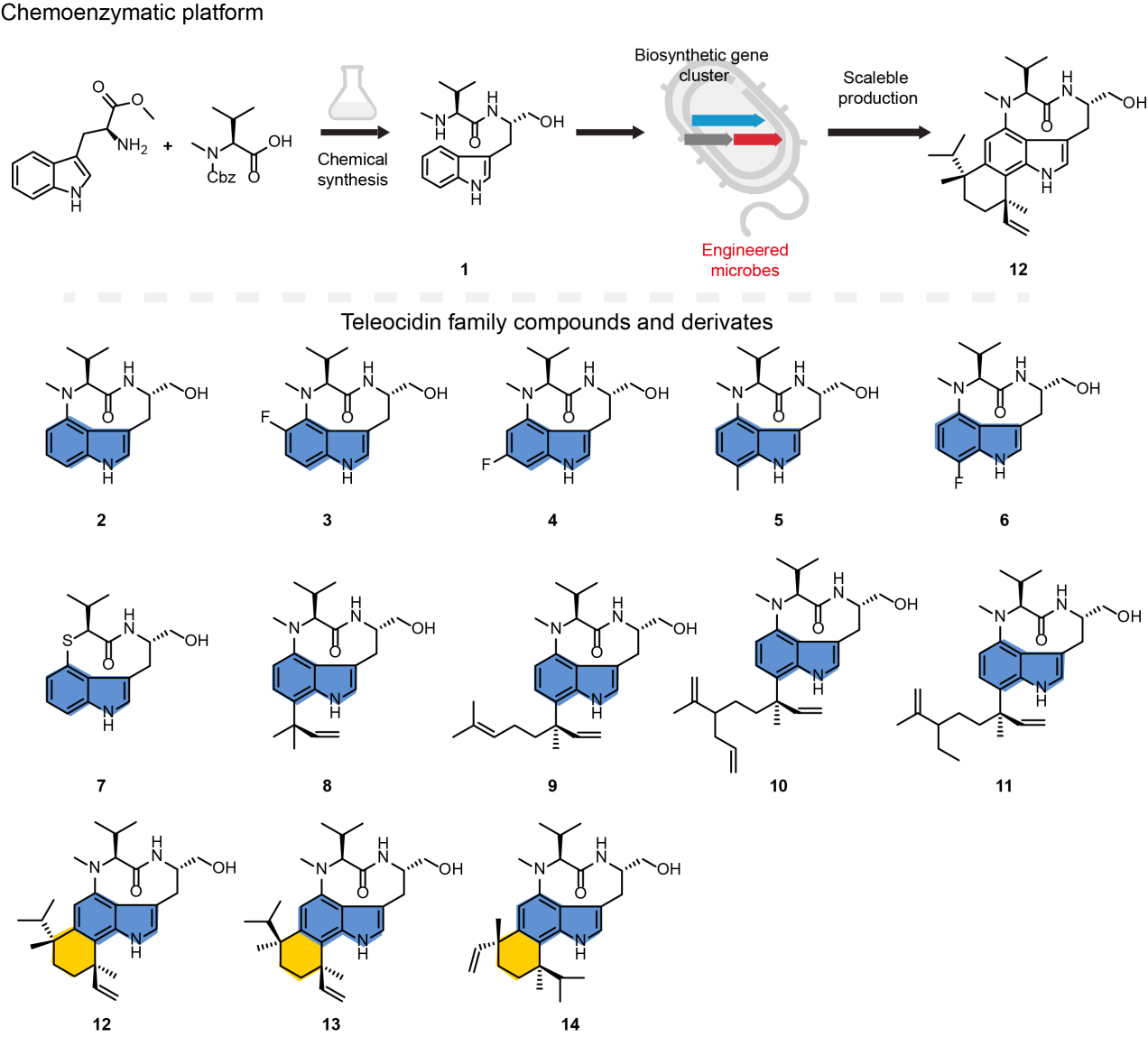 针对上述挑战,宋恒课题组建立了一个可扩展的化学酶平台,将模块化酶工程与快速化学合成相结合,能够实现高效合成13种结构不同的杀鱼菌素同系物和衍生物。这一策略的核心是通过化学合成快速、大规模地获得NMVT底物后通过生物催化实现关键步骤的高选择性转化。通过蛋白质工程,我们增强了关键酶TleB的催化活性,并建立了一个双菌株共培养系统从而以极高的效率将NMVT转化为杀鱼菌素,最高滴度达到714.7 mg/L。为了进一步证明平台的通用性,宋恒课题组设计了一个单细胞工厂,能够直接生产Indolactam V、Teleocidin A1、Pendolmylcin和Teleocidin B4等一系列化合物。该平台还可用来生产五种新的Indolactam V类似物和两种teleocidin A1 衍生物。通过中试规模发酵验证了工业可扩展性,产生了430 mg Indolactam V、170 mg Teleocidin A1和300 mg Teleocidin B衍生物。这些结果将模块化化学酶策略与可扩展的微生物底盘相结合,为高价值天然产物的从头生物合成建立了一个范式,还为复杂单萜吲哚生物碱的可持续工业规模生产勾绘了蓝图。