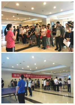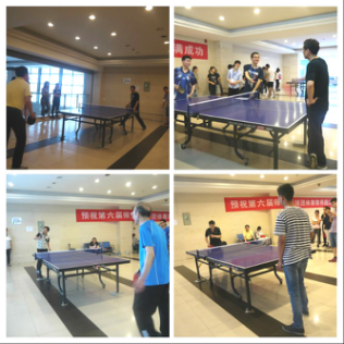 乒乓球赛共有混双、男双、女双、男单及女单五个项目。此次比赛采用积分制,半决赛和决赛采用淘汰制,即上午8支参赛队伍分为两组,组内四队循环对战,每赢一局积两分,各组积分前两名出线,产生四强,进入下午的半决赛。在比赛过程中,各个团队成员都充满激情与战斗力,争取发挥出自己的最好水平。在赛场上,有为团队成员呐喊助威的,有站在一旁为团队成员加油鼓劲的,有为团队成员“出谋划策”的……到处充满着赛场紧张刺激的氛围。