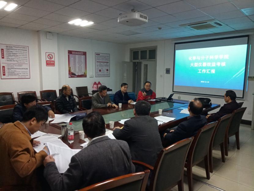 学院党委书记卢昌宁、副院长周洪元接待专家组并出席工作汇报会议。雷敬炎处长首先简要介绍了此次考核工作的背景、工作目标与任务。卢昌宁书记对专家组莅临学院指导工作表示欢迎,对学校实验室设备与管理处一直以来在大型仪器设备购置、共享平台建设等方面对学院的大力支持表示感谢。周洪元副院长代表学院汇报2017-2018年度大型仪器设备管理与使用情况,重点介绍了大型仪器平台的工作情况。学院大型仪器平台建设项目从2015年启动,经过近几年的发展,平台已初具规模,现有大型仪器设备35台,总值逾5000万元。学院成立了平台发展咨询委员会和管理委员会,聘请专业的管理团队负责平台的日常运行,从预约使用、管理维护到服务收费、考核奖惩。测试用户涵盖学院所有二级学科、校内兄弟院系及省内外部分高校及科研院所。平台成果丰硕,仅2018年已有多篇成果发表在Nat. Comm.、JACS、Angew等高影响力SCI刊物上。最后周洪元副院长根据此次效益考核自查结果,提出了目前学院在大型仪器设备管理与使用方面存在的问题及下一步改进的方向。