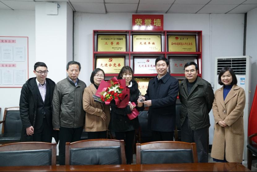 在学院党员活动室里,校党委副书记沈壮海高度表扬了吴雅珣见义勇为的举动和机智妥当的处置,亲切地问候她学习、生活情况,并表达了美好祝愿。