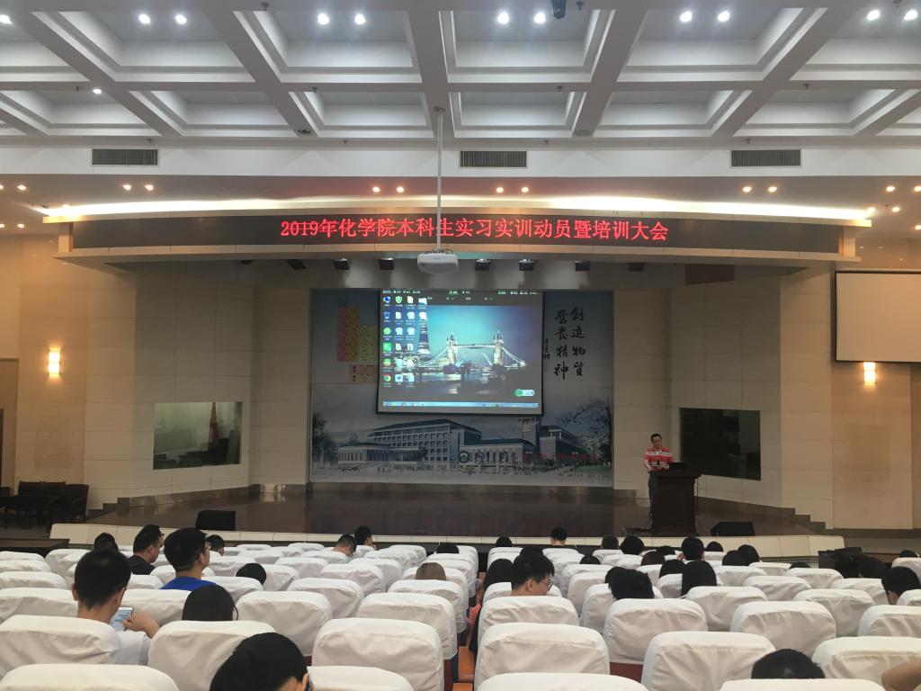 (通讯员:陈晋雯、蒋莉)2019年7月4日上午9:00,2019年化学院本科生实习实训动员暨培训大会在创隆厅顺利举行。院党委副书记吴奕、各实习实训队伍指导老师出席大会。本次大会以各队指导老师与学生见面、行前安全教育、财务报销解答、校友邦系统演示操作等为主要内容,大会由本科生辅导员蒋莉老师主持。
