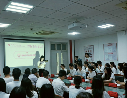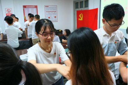 党委副书记徐冶琼宣读了2018-2019学年学院预备党员名单,并对新加入党组织的预备党员们表示欢迎。接着,各位党支部书记为自己支部新入党的同学佩戴党员徽章,并在徐冶琼书记的带领下,齐齐面向党旗庄严宣誓。这整齐洪亮的宣誓声中,既饱含着新加入党员队伍的同志们的决心和信心,也饱含着正式党员同志们重温入党誓词感受涌动初心的激动。
