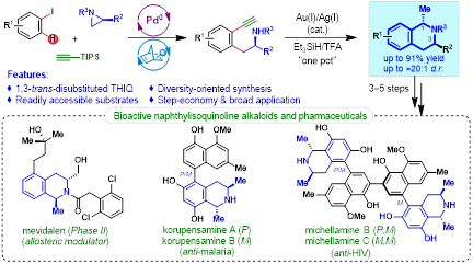 周强辉团队近年来聚焦于Pd/NBE协同催化策略开发多取代芳烃的高效合成新方法。他们先后发展了异色满(Angew.Chem. Int.Ed,2018, 57, 3444)和1,3-顺式双取代四氢异喹啉(Angew.Chem. Int. Ed.2018,57, 10980)的新合成方法,并应用于复杂天然产物(–)-berkelic acid的全合成(Angew.Chem. Int. Ed.2021,60, 5141)。在这些研究基础上,该课题组进一步发展了Pd/NBE协同催化与金催化环化/还原的串联反应,只需使用简单易得的三种基础化学品为原料,就可以快速构建出结构多样化的1,3-反式二取代四氢异喹啉化合物。他们应用该方法简洁地合成了药物分子mevidalen的一个类似物,并发展了抗疟活性天然产物korupensamine A和B的5步合成法以及抗HIV活性天然产物michellamine B和C的7步合成法,是迄今最短且最高效的全合成路线。这些高效的合成应用展示了该合成方法在制备1,3-反式四氢异喹啉生物碱及相关药物活性分子方面的巨大潜力。