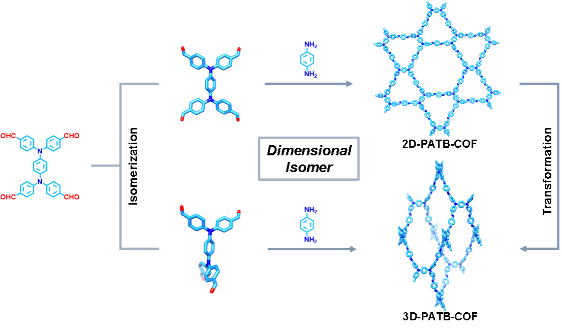 框架化学是研究框架材料的一门新兴学科,对分离、存储、催化等领域产生了重要影响。与有机化学中原子的不同排列方式可产生分子异构体类似,框架化学中分子构筑单元的不同排列方式也可形成框架异构体。如果由相同分子前体分别构筑具有不同维度的异构体,则可得到一类特殊异构体,汪成教授等人将其命名为维度异构体。合成维度异构体不仅可极大地丰富框架化学的基本概念,还可能构筑性质截然不同的功能材料,但目前尚未见报道。共价有机框架(COF)由分子前体通过共价成键组装而成,是一类具有代表性的框架材料,在诸多领域具有广泛应用。理论上,从相同分子前体出发,通过调控分子构象,有可能构筑二维和三维COF。由于二维COF具有规整一维孔道而三维COF具有贯穿孔道和大量开放位点,此时将得到具有不同性质和功能的COF。