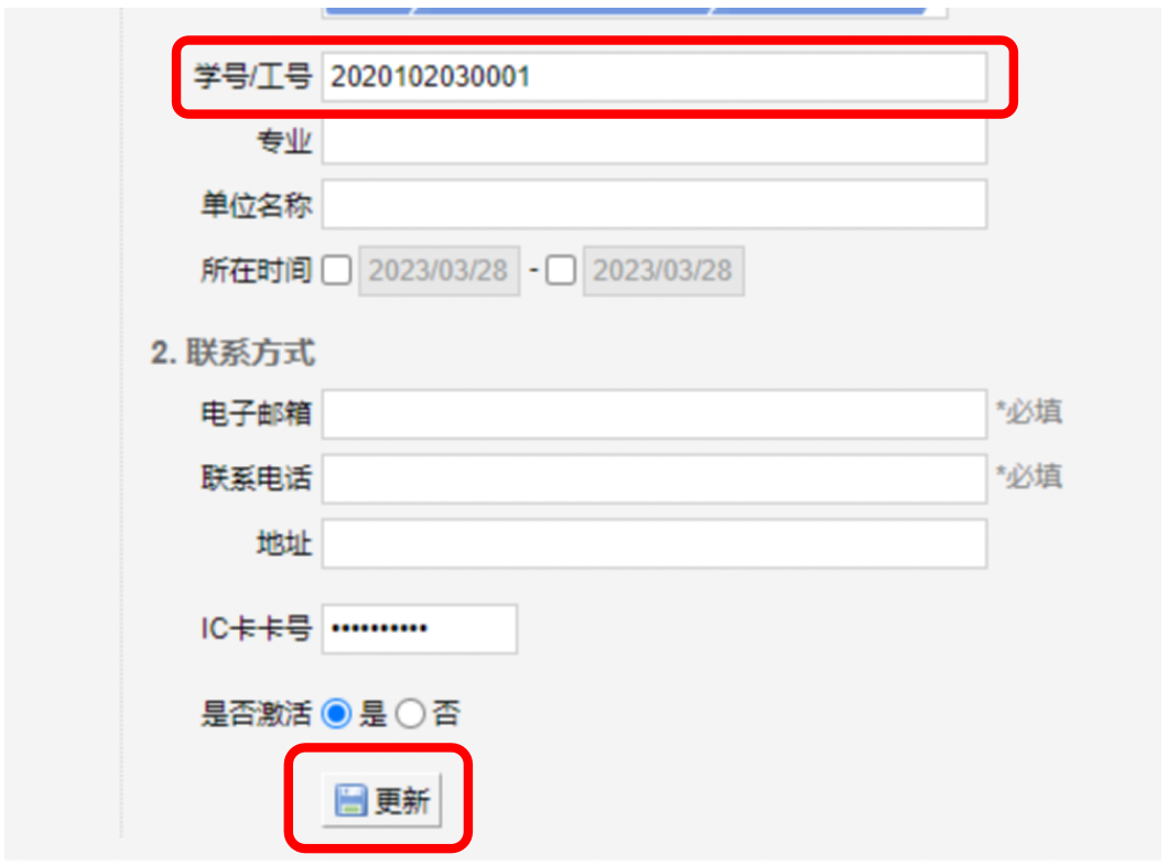 4、在“学号/工号”栏填入学号或工号,并点击更新;