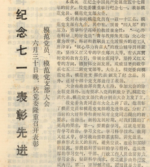 在庆祝中国共产党诞生五十七周年的前夕,校党委隆重举行纪念七一,表彰模范党员、模范党支部大会。受到表彰的模范党员有一百一十三名,模范党支部有九个。其中有:顶着“四人邦”的压力,勇攀科学高峰的化学系教授查全性;“一心扑在科研上的好党员”青年教师朱英国; 全心全意为教学、科研和教职员工生活服务的老工人唐泽家; “倾心尽力育苗人”的政治辅导员林豪生;坚持又红又专的学生郑兴太等。大会上,校党委向模范党员、模范党支部代表颁发了纪念品。