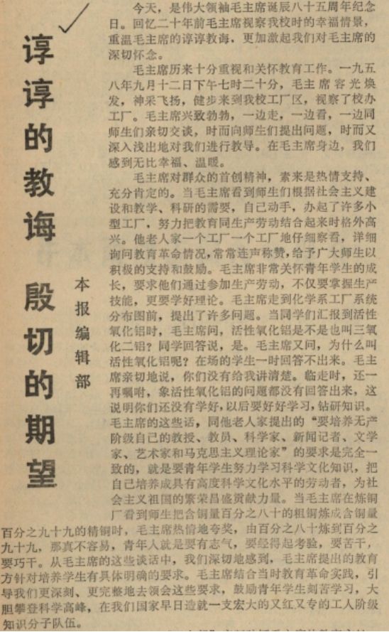 工厂区,视察了校办工厂。毛主席兴致勃勃,一边走,一边看,一边同师生们亲切交谈,时而向师生们提出问题,时而又深入浅出地对我们进行教导。在毛主席身边,我们感到无比幸福、温暖。毛主席对群众的首创精神,素来是热情支持、充分肯定的。当毛主席看到师生们根据社会主义建设和教学、科研的需要,自己动手,办起了许多小型工厂,努力把教育同生产劳动结合起来时格外高兴。他老人家一个工厂一个工厂地仔细察看,详细询问教育革命情况,常常连声称赞,给予广大师生以积极的支持和鼓励。毛主席非常关怀青年学生的成长,要求他们通过参加生产劳动,不仅要掌握生产技能,更要学好理论。毛主席走到化学系工厂系统分布图前,提出了许多问题。当同学们汇报到活性氧化铝时,毛主席问,活性氧化铝是不是也叫三氧化二铝?同学回答说,是。毛主席又问,为什么叫活性氧化铝呢?在场的学生一时回答不出来。毛主席亲切地说,你们没有给我讲清楚。临走时,还一再嘱咐,像活性氧化铝的问题都没有回答出来,这说明你们还没有学好,以后要好好学习,钻研知识。毛主席的这些话,同他老人家提出的“要培养无产阶级自己的教授、教员、科学家、新闻记者、文学家、艺术家和马克思主义理论家”的要求是完全一致的,就是要青年学生努力学习科学文化知识,把自己培养成具有高度科学文化水平的劳动者,为社会主义祖国的繁荣昌盛贡献力量。当毛主席在炼铜厂看到师生把含铜量百分之八十的粗铜炼成含铜量百分之九十九的精铜时,毛主席热情地夸奖,由百分之八十炼到百分之九十九,那真不容易,青年人就是要有志气,要经得起考验,要苦干,要巧干。从毛主席的这些谈话中,我们深切地感到,毛主席提出的教育方针对培养学生有具体明确的要求。毛主席结合当时教育革命实践,引导我们更深刻、更完整地去领会这些要求,鼓励青年学生刻苦学习,大胆攀登科学高峰,在我们国家早日造就一支宏大的又红又专的工人阶级知识分子队伍。