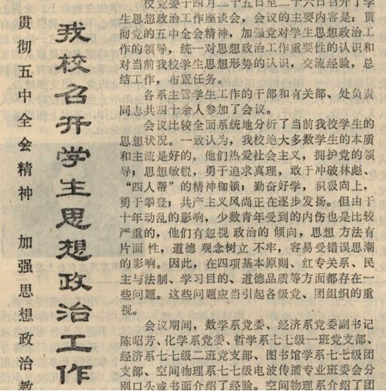 会议期间,数学系党委、经济系党委副书记陈昭芳、化学系党委、哲学系七七级一班党支部、经济系七七级二班党支部、图书馆学系七七级团支部、空间物理系七七级电波传播专业班委会分别口头或书面介绍了经验。