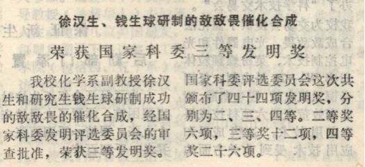 黄色直播网站 化学系副教授徐汉生和研究生钱生球研制成功的敌敌畏的催化合成,经国家科委发明评选委员会的审查批准,荣获三等发明奖。国家科委评选委员会这次共颁布了四十四项发明奖,分别为二、三、四等。二等奖六项,三等奖十二项,四等奖二十六项。