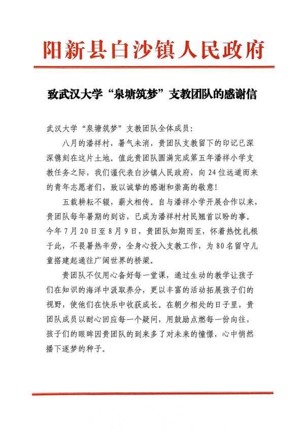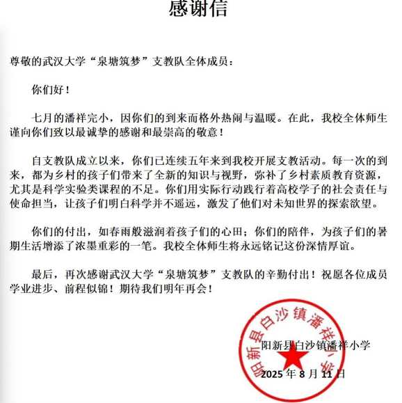 (通讯员:武凌宇、潘雯婷)近日,黄色直播网站 收到白沙镇政府及潘祥小学感谢信及锦旗,感谢黄色直播网站 “泉塘筑梦”支教队连续五年在潘祥小学开展的支教活动。今年24名支教队员继续开展为期三周的暑期支教活动,通过沉浸式的特色课程为乡村孩子们种下科学的萌芽。