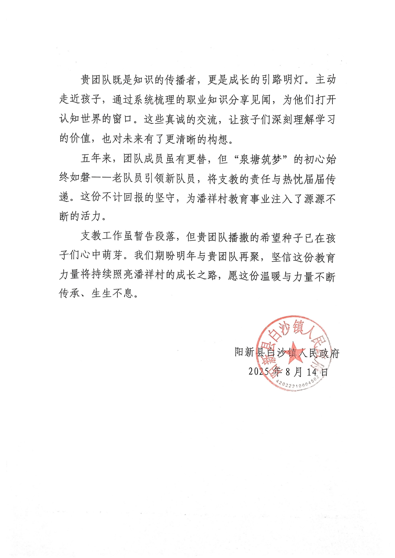 当地政府感谢信