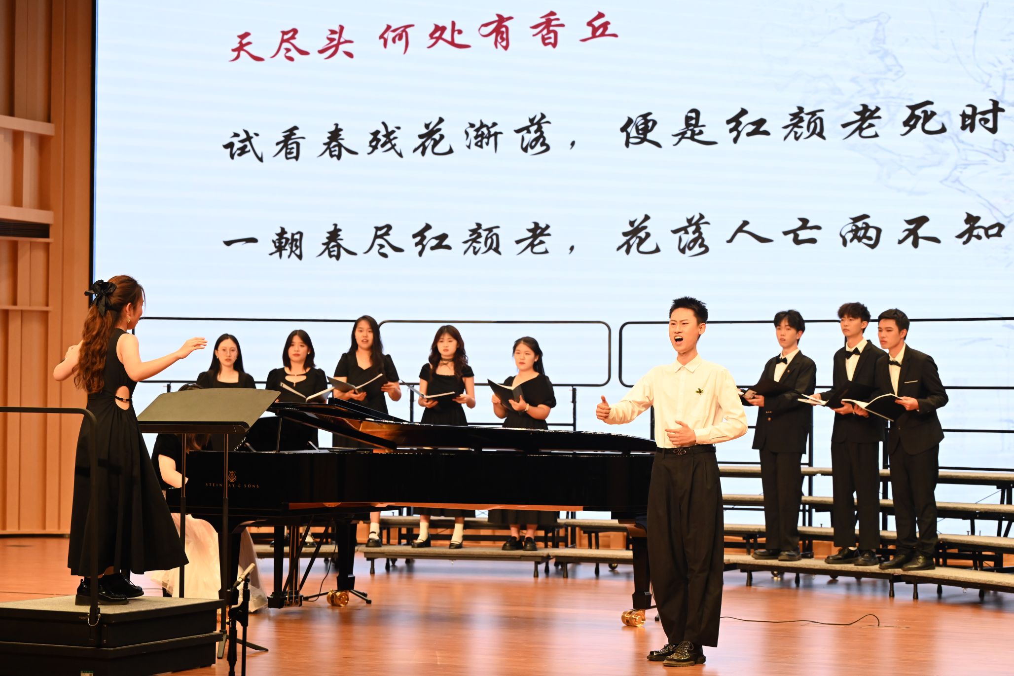 化院合唱团的一曲《雪花的快乐》拉开了音乐会的上半场的序幕。《Love is an open door &彩虹》《青玉案·元夕》《是否》《葬花吟》《绽放&贝加尔湖畔》《这世界那么多人&Glow&再回首》《Enter with song &阿妹》构成了上半场的精彩单元,合唱团成员们精彩的演绎、美妙的和声,让观众仿佛置身美的海洋。