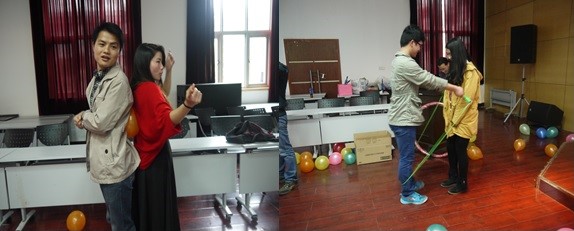本次活动分三个阶段,第一项是初相识,来自化院、外语、电信、计算机等学院的单身硕博进行抽签“随缘”分组,男女平均,面对面建团队群。在围成两个大圈后,进行了自我介绍,并为自己的团队起了队名,最终诞生了颜值爆表队和俊男美女队。第二项是趣味运动会,第一个游戏是一圈到底,男生女生手牵手站在一排,用呼啦圈传递,大家都玩的乐在其中。第二个游戏是男女双人跳绳1分钟,开始大家都面对面不好意思,随着游戏的深入,大家都变得自然而且玩的很开心。虽然最后俊男美女队以177个获得胜利,但是我们都懂得结果不重要,关键是这面对面的过程。第三个游戏是男女背对背运气球往返接力,同样俊男美女对最终取得胜利。最后一个游戏是“青春动力小火车”,男生女生混合站在一起组成小火车,不得不赞叹颜值爆表队,简直以风的速度飞跃终点取得胜利。