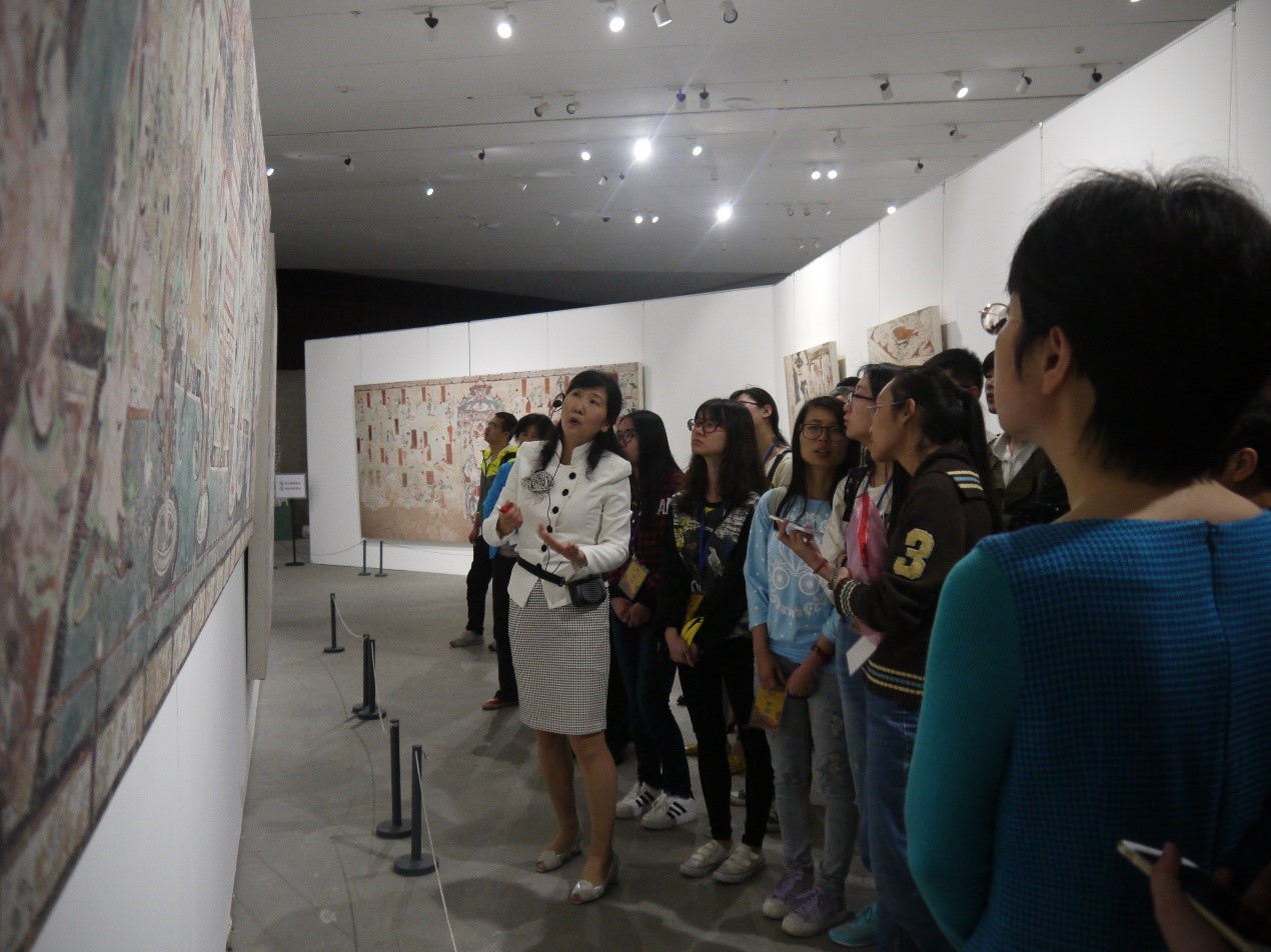 (图文:李焰)2016年4月21日中午,院工会、院学生会、院研究生会组织40余名师生在万林艺术博物馆参观敦煌壁画艺术精品展。此次活动,学院邀请到历史学院世界史专家、敦煌壁画艺术展义务讲解员——潘迎春教授,带大家领略了敦煌文化的传世风采。