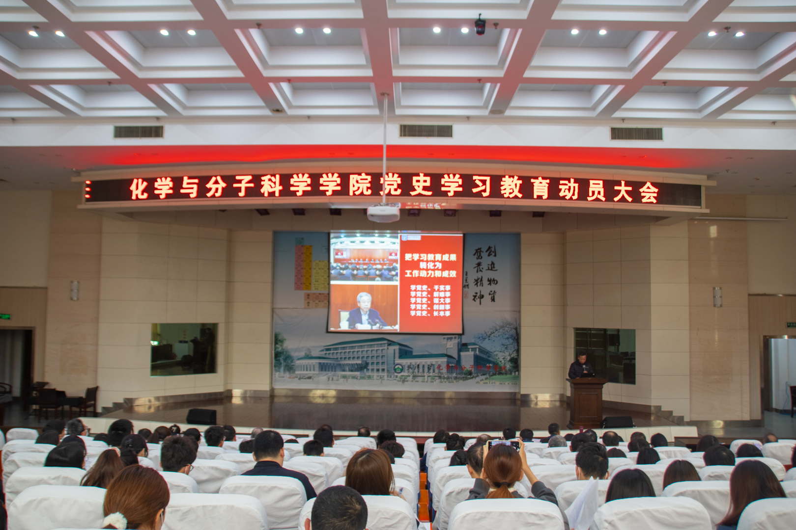 深入学习贯彻习近平总书记在党史学习教育动员大会上的重要讲话精神,扎实开展党史学习教育,4月8日下午,武汉大学化学与分子科学学院于创隆厅召开党史学习教育动员大会。学院党政班子全体领导、党委委员、各二级单位负责人、离退休党支部书记、在职教职工党支部及学生党支部全体委员、机关党支部全体党员、研究生会及学生会学生代表参加会议。学院党委副书记王中全主持会议。