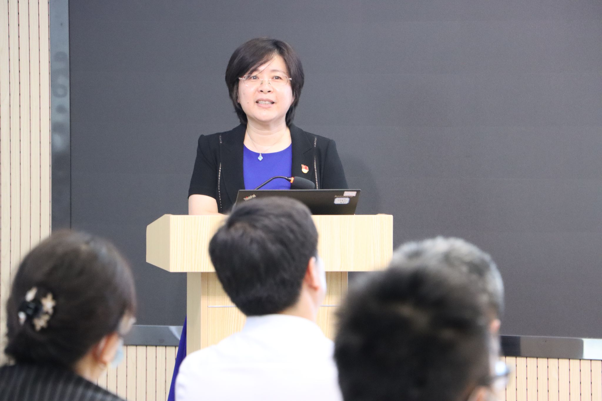 院党委书记王丽萍面向全院讲党课,首先领学了习近平总书记在中共中央政治局第五次集体学习以及在科学家座谈会上重要讲话精神,并分享了学习体会。她强调,建设教育强国,是全面建成社会主义现代化强国的战略先导,为党育人为国育才是高校的根本目标;作为化学基础学科,学院必须把服务国家战略实现科技自立自强和拔尖创新人才自主培养作为高质量发展的两条主线,瞄准世界科技前沿和国家重大战略需求进一步推进科研创新,不断提升原始创新能力和人才培养质量。她表示,学院近年来不断深化改革,以国家双碳战略和人类健康需求为导向重新凝练学科发展方向,构建了能源化学、分子医学学科发展双赛道,并以此为基础进一步引领深化拔尖创新人才自主培养——2023年学院新增设了本科生化学新能源自强班,并正在组织实施化学基础学科拔尖创新人才(研究生)培养改革计划,有的放矢培养国家战略人才和急需紧缺人才,提升学院学科对高质量发展的支撑力、贡献力。