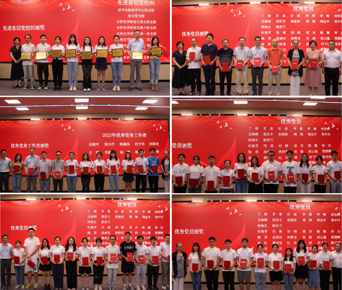 王中全副书记宣读《中共武汉大学化学与分子科学学院委员会关于表彰先进基层党组织、优秀共产党员和优秀党务工作者的决定》。此次学院党委共评选表彰了化学实验教学中心党支部等9个先进基层党组织,吴晓军等11名优秀党务工作者,周翔等50名优秀共产党员。院党委书记王丽萍,党委委员兼副院长周金平、甘泉,党委委员唐红定为受到表彰的集体和个人领奖。