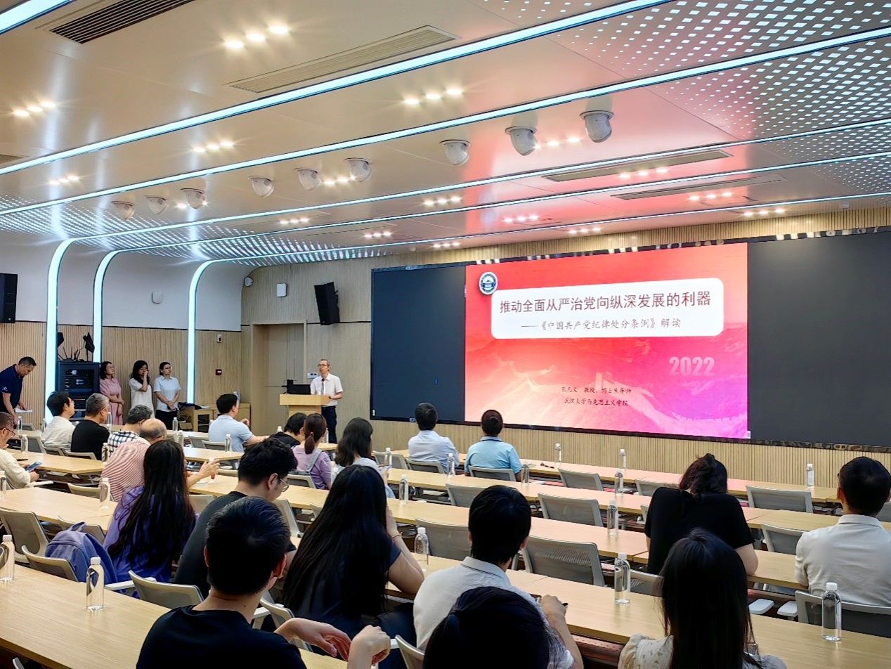 武汉大学马克思主义学院教授孔凡义应邀作题为“推动全面从严治党向纵深发展的利器——《中国共产党纪律处分条例》解读”的专题报告,从修订历史、修订原因、重要变化以及落实措施四个方面出发,结合案例对《中国共产党纪律处分条例》进行了生动详实的解读。他提到,全面从严治党强调“苍蝇老虎一起打”,《中国共产党纪律处分条例》历经三次修改,对人民群众身边的贪污腐败行为打击力度不断增加。他强调,作为规范党组织和党员行为的基础性规定,《中国共产党纪律处分条例》是全党在政治上同党中央保持高度一致的重要保证,根据形势的发展对其进行修订,是确保各级党组织和全体党员深刻领悟“两个确立”的决定性意义、切实做到“两个维护”的必然要求。