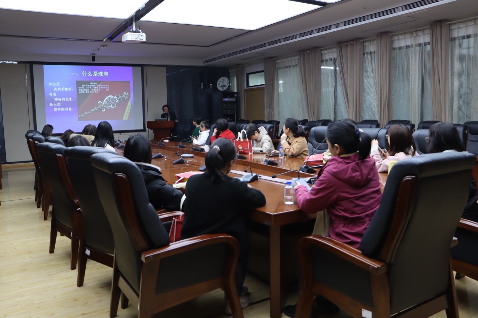 为促进全员女教职工的身心健康,随后组织女教职工参观游览了地质大学珠宝学院,珠宝学院狄敬如老师就珠宝鉴赏相关知识开设了生动有趣的科普讲座,并带领大家在珠宝展厅、珠宝检测中心等地进行了实地参观。