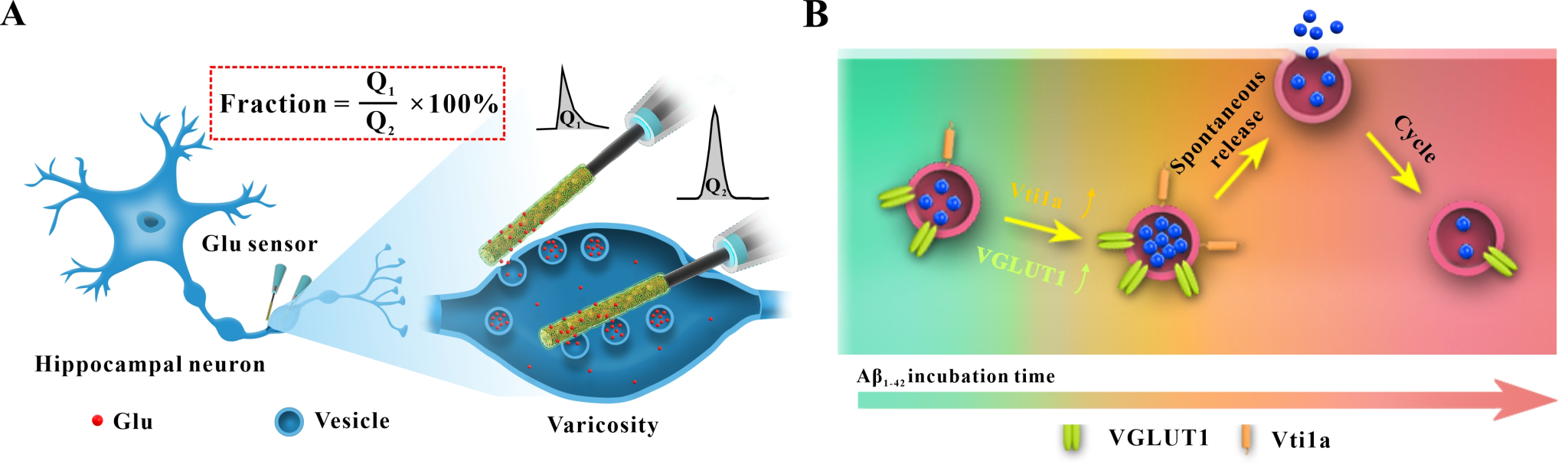 图1.(A)神经元曲张体囊泡谷氨酸含量及其释放量检测示意图;(B)AD不同阶段Aβ42寡聚体影响细胞胞吐紊乱机制。