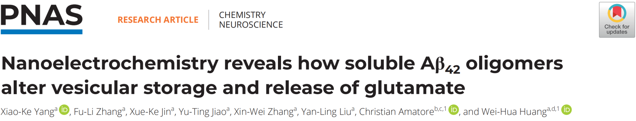 黄卫华教授团队和法国巴黎高等师范学院Christian Amatore教授合作,在国际知名期刊《PNAS》上发表题为“Nanoelectrochemistry reveals how soluble Aβ42oligomers alter vesicular storage and release of glutamate”的研究成果。