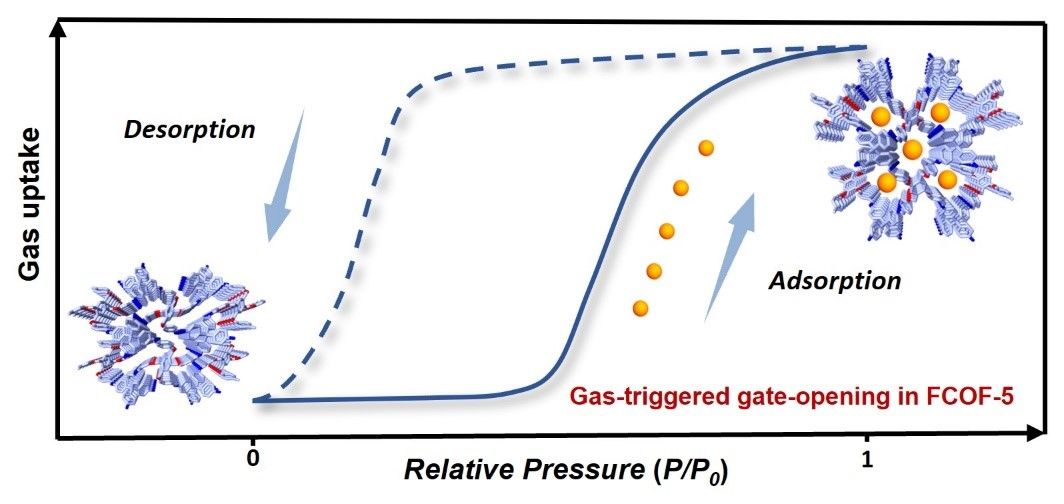 在柔性三维COF方面,他们对课题组前期报道的柔性框架FCOF-5(J. Am. Chem. Soc., 2021, 143, 2123)的气体吸附行为进行了系统探究。结果表明,FCOF-5对多种气体分子(包括二氧化碳、丙烯、丙炔等)表现出独特的“S型”吸脱附曲线,原位联用技术证明气体吸附过程中骨架的C-O单键发生旋转,从而产生开孔吸附。基于开口压力的差异,FCOF-5可实现丙烯/丙炔混合气中丙烯的高效提纯。此研究不仅表明由柔性分子前体构筑的三维COF是一类具有开孔吸附特性的新型柔性多孔晶体,还为后续设计对低碳烃具有优异吸附分离性能的柔性三维COF提供了指导。相关成果发表在《美国化学会志》(Journal of the American Chemical Society)上,2022届博士刘晓玲和南开大学王志方博士为论文共同第一作者,汪成教授为通讯作者。