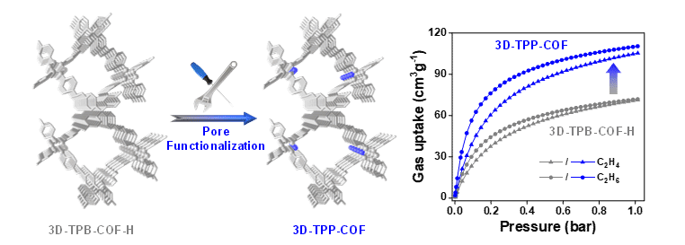 在刚性三维COF方面,他们通过引入吡啶功能单元,精准调控孔道环境,定制合成了一种具有反转吸附特性的高结晶性刚性三维COF(3D-TPP-COF)。研究发现,相比于同构的3D-TPB-COF-H(Angew. Chem. Int. Ed., 2019, 58, 9770), 3D-TPP-COF中的吡啶基团与乙烷分子形成额外的C-H···N相互作用,可显著提高乙烷吸附量和乙烷/乙烯吸附选择性,进而实现乙烯的高效一步提纯。此研究对开发具有特定孔道环境的三维COF并用于高效气体吸附分离提供了指导。相关成果发表在《自然·通讯》(Nature Communications)上,2023届博士谢阳、中国科学院福建物质结构研究所王文经副研究员和北京大学博士研究生张泽岳为论文共同第一作者,汪成教授、中国科学院福建物质结构研究所袁大强研究员和北京大学孙俊良教授为共同通讯作者。