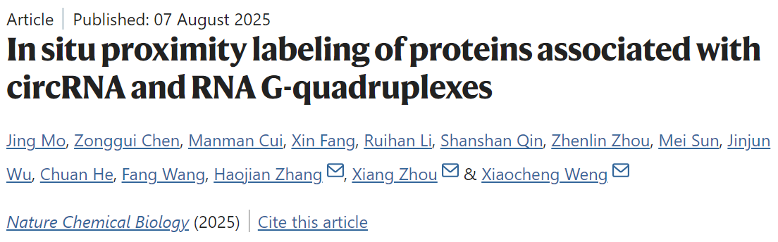 2025年8月7日,武汉大学化学与分子科学学院翁小成/周翔团队联合医学研究院张好建课题组在《自然·化学生物学》(Nature Chemical Biology)在线发表题为“In-situ proximity labeling of proteins associated with specific circRNA and RNA G-quadruplex”的研究论文。莫婧博士、陈宗贵博士、崔嫚嫚博士为本文的共同第一作者,翁小成教授、周翔教授和张好建教授为论文的共同通讯作者,武汉大学为唯一通讯单位。