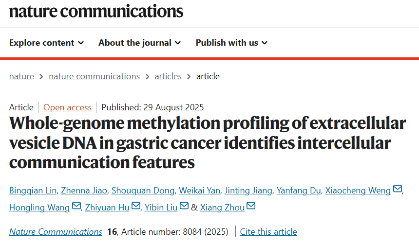 2025年8月29日,《自然·通讯》(Nature Communications)正式发表了由武汉大学化学与分子科学学院周翔教授/翁小成教授团队、刘艺斌教授课题组、武汉大学医学研究院胡致远教授课题组、武汉大学中南医院消化内科王红玲主任团队共同完成的一项研究成果。论文题目为“Whole-genome methylation profiling of extracellular vesicle DNA in gastric cancer identifies intercellular communication features”。武汉大学周翔教授/翁小成教授团队的博士后林冰倩博士、胡致远教授课题组的焦振娜与武汉大学中南医院消化内科王红玲主任团队的董守权医生为论文共同第一作者,周翔教授、刘艺斌教授、胡致远教授、王红玲教授和翁小成教授为论文的共同通讯作者,武汉大学为唯一通讯单位。