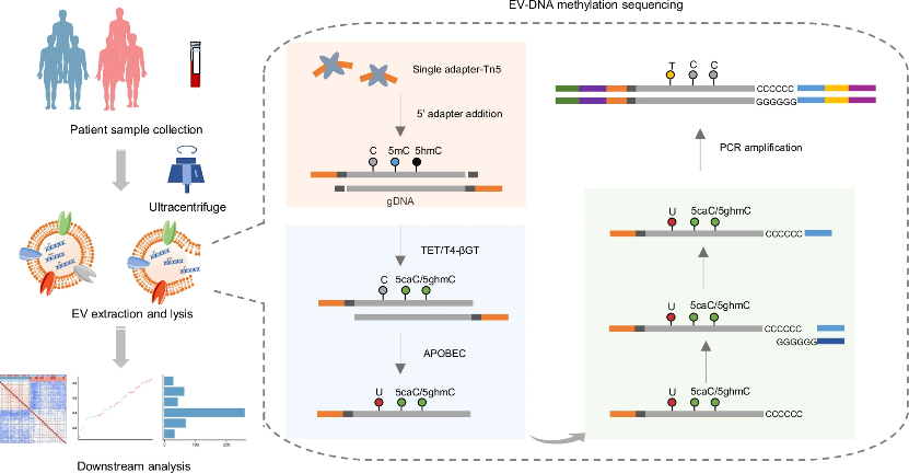 外泌体(EVs)作为癌症诊断和预后研究中的潜力生物标志物,正引起广泛关注。然而,基于EV-DNA甲基化的液体活检技术在临床应用中仍处于探索阶段。由于EV-DNA的含量较低且片段较长,在临床样本中进行全基因组甲基化分析具有一定挑战性。针对这一问题,研究团队开发了一种创新的Tn5辅助酶促甲基化测序技术——TEMPT,该技术结合了单接头Tn5转座酶与转化后加尾技术,并联合酶促转化法(Em-seq)。通过这一方法,成功实现了微量EV-DNA样本的全基因组甲基化测序,同时避免了传统亚硫酸盐处理带来的各种问题。