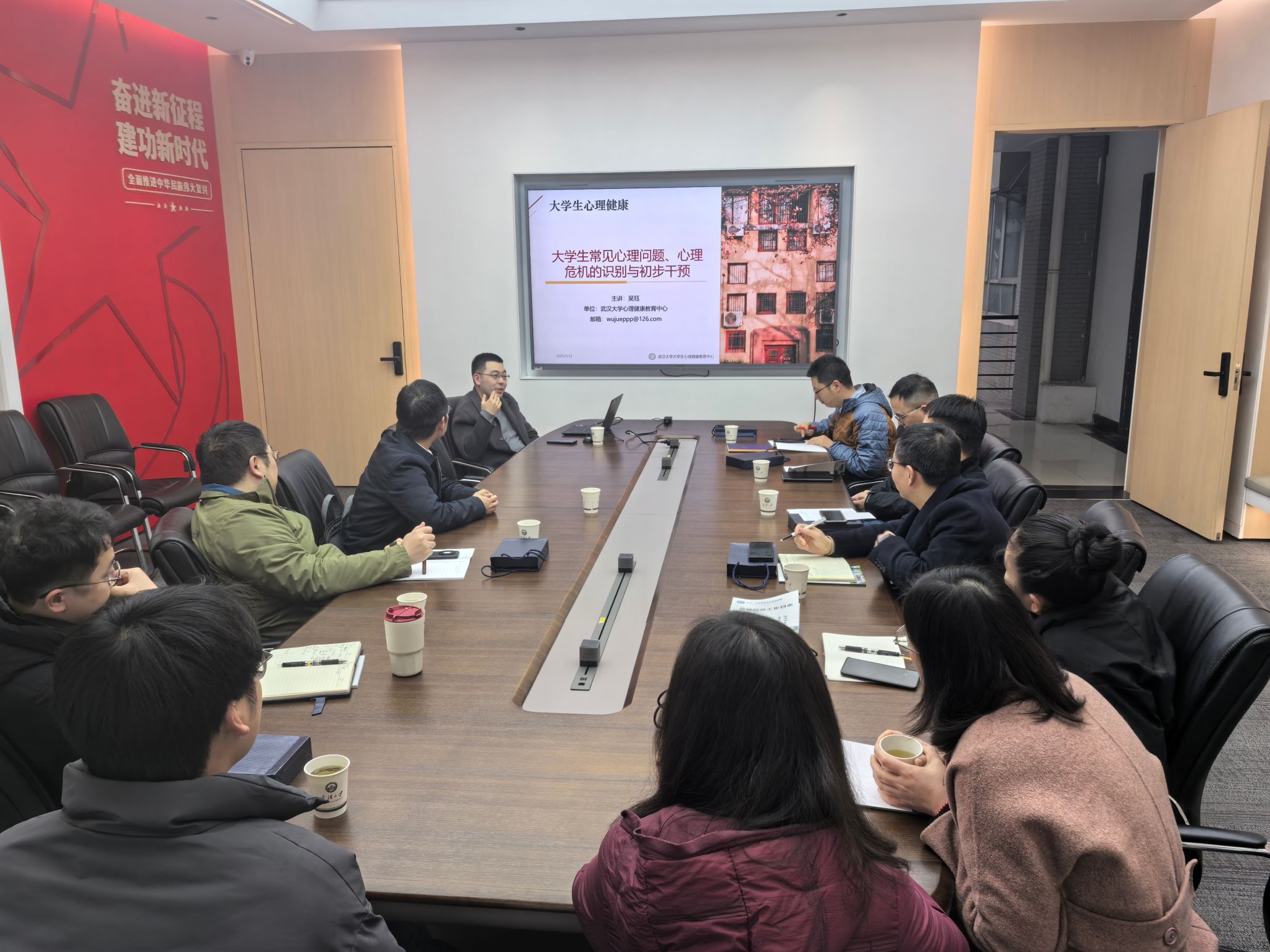 为加强班级导师队伍建设,3月13日下午,化学与分子科学学院在C220党建活动室举办第二期班级导师专题培训。本次培训特邀武汉大学心理健康教育中心专职教师吴珏担任主讲,围绕"大学生常见心理问题、心理危机的识别与初步干预"开展专业指导。学院党委副书记何剑超、班级导师、辅导员参加培训。