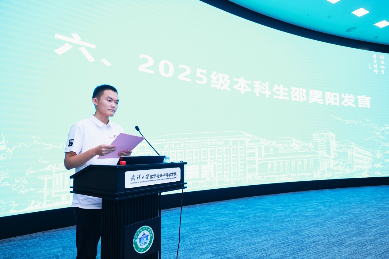 随后,2025级本科生代表、第38届全国化学奥林匹克竞赛金牌获得者邵昊阳同学发言。他回顾了自己与化学结缘的过程,表达了对学校与学院氛围的热爱,并代表全体新生郑重表态:尽快适应大学生活,珍视集体温暖,深耕专业学习,积极参与科研,努力成长为具有创新精神与社会责任感的化学人才。