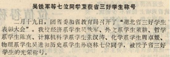 二月十九日,团省委和省教育局召开了“湖北省三好学生表彰大会”。我校经济系学生吴铁军、外文系学生董耕、哲学系学生陈真、计算机科学系学生张汉涛、化学系学生周卓媛、物理系学生吴进和历史系学生孙晓林七位同学,被授予省三好学生的光荣称号。