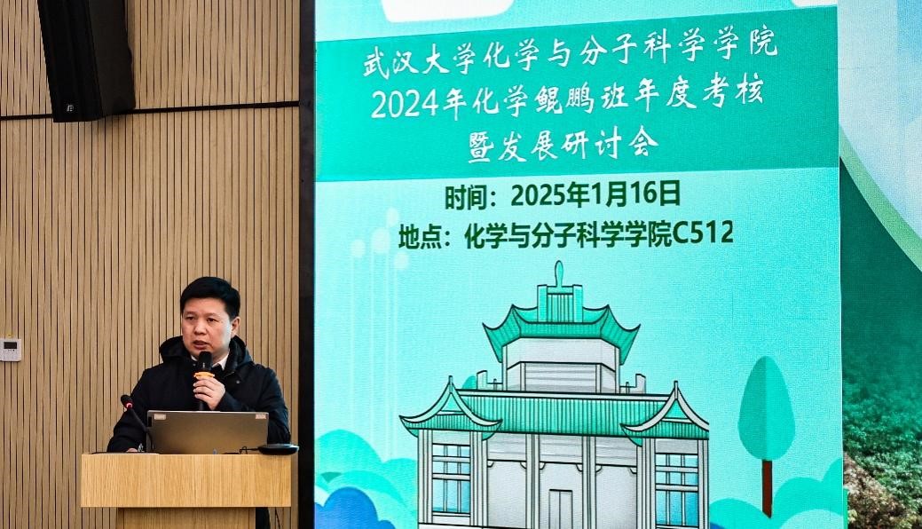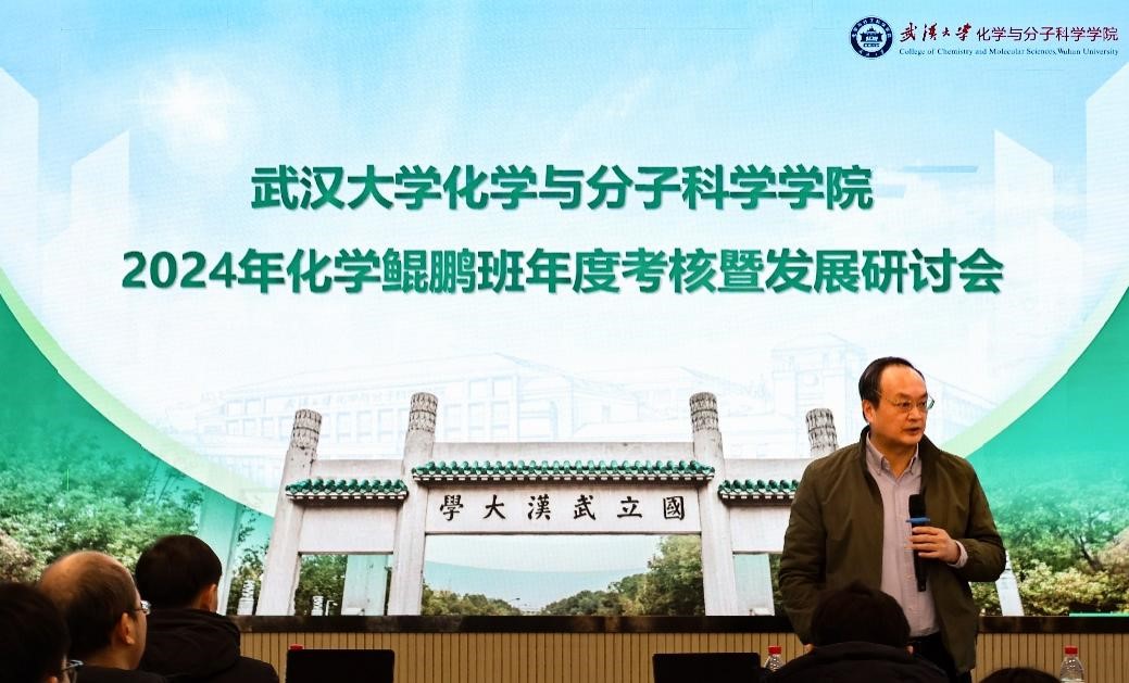 2025 年 1 月 16 日,化学鲲鹏班年度考核暨发展研讨会顺利举行。武汉大学研究生院研究生培养处副处长陈琛、国际交流部副部长(主持工作)邓鹤翔教授、科学技术发展研究院副院长袁荃教授、发展规划与学科建设办公室副主任周强辉教授、化学与分子科学学院党委书记黄卫华教授、院长庄林教授、党委副书记何剑超、副院长周金平教授、刘文博教授、翁小成教授、蒋风雷教授、鲲鹏班培养指导委员会专家、鲲鹏班全体同学参加会议。