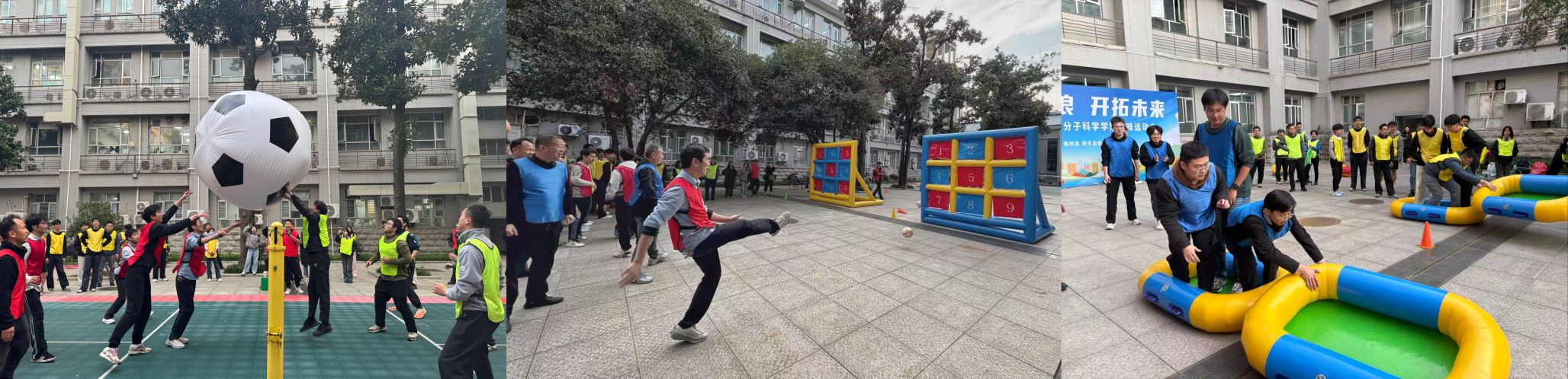 下午14:00,教职工从学院东门出发,分两条路线徒步。大家沿途赏景交流,在轻松愉悦的氛围中完成了约4.3公里的行程,增进了彼此情谊。随后在化中楼中庭举行的趣味运动会设置了陆地龙舟、八仙过海、同舟共济、九宫射门、巨型排球及拔河等多个项目。师生混合组队,在协作中配合默契,比赛中笑声不断,现场气氛热烈融洽。