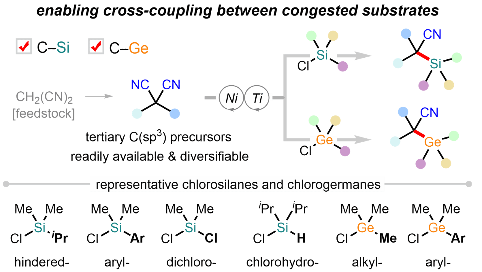 在本研究中,他们利用镍钛双金属催化策略成功实现了双取代丙二腈与氯硅/锗烷的脱氰偶联,得到了一系列大位阻的全取代硅烷与锗烷。该反应对氯硅烷具有良好的兼容性,例如三烷基氯硅烷、芳基氯硅烷、二氯硅烷以及氢氯硅烷都可兼容,并且反应条件同样适用于与氯锗烷的偶联。该反应可以一锅法合成相应的β-氨基硅/锗烷,产物衍生化可以合成硅杂环,也可以将产物应用于Hiyama偶联。机理研究表明是脱氰偶联可能经过了钛催化生成的负离子过程,不涉及自由基中间体。更重要的,该工作初步表明丙二腈可以直接作为一种稳定易得的三级碳偶联试剂前体,有望实现其他类型的交叉偶联反应。