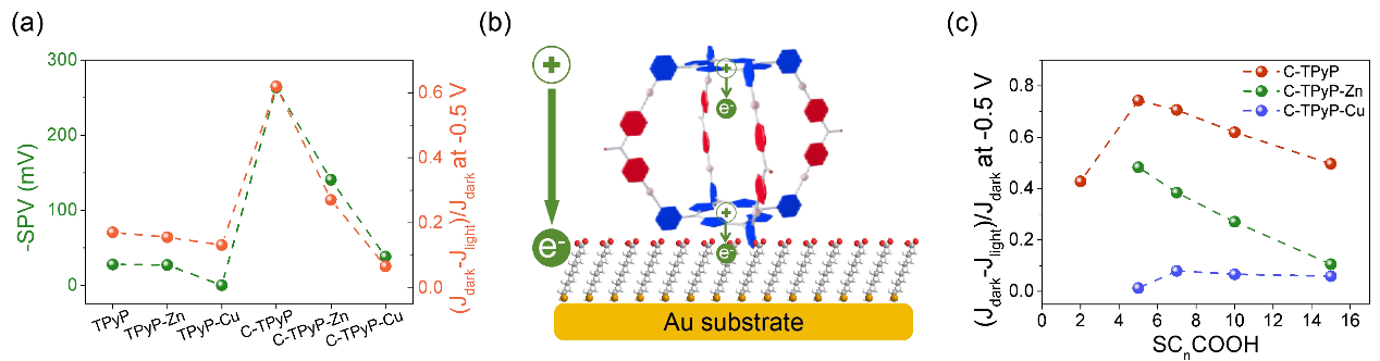 图3. 卟啉单体与卟啉超分子笼的表面光电压与光响应电荷传递行为