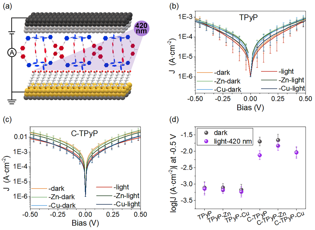 许多卟啉类衍生物在光、热和化学环境下具有优异的稳定性,是超分子电子学的理想构建单元。同时,其在可见光范围内表现出强吸收特性,在光照下可通过电子-空穴对分离产生电荷分离态,灵活调控电荷传递性质。作者通过引入刚性配体增加了两个卟啉单元之间的空间距离,减弱了它们之间的相互作用,构建了相较于单体具有更高电子-空穴对分离效率的卟啉超分子笼结构。凭借这一优势,卟啉超分子笼在固态分子结中实现了更显著的光响应电荷传递性质。