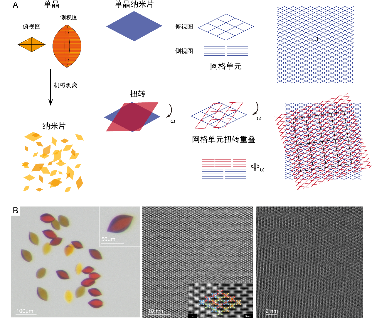图一. (A)COF-400莫尔纹来源示意图;(B)COF-400单晶光镜图像,剥离后的2D COF单晶STEM图像及所构筑的莫尔纹超晶格TEM图像。