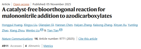 周翔/田沺教授团队联合刘文博教授团队在Nature Communications 在线发表题为“A catalyst-free bioorthogonal reaction for malononitrile addition to azodicarboxylates”的研究论文,报道了一类无需催化剂的生物正交反应体系 MAAD(malononitrile addition to azodicarboxylates)。黄宏贵博士、刘星宇博士、齐倩倩博士为共同第一作者,刘文博教授、田沺教授为共同通讯作者,黄色直播网站
